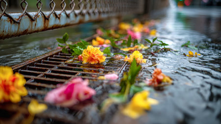 After a rainfall, colorful flowers float on the surface of water near a storm drain hatch, highlighting the contrast between nature and urban life.