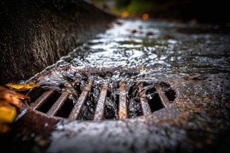 Flowing water through a drainage channel on a busy urban street, highlighting efficient water management in the city.