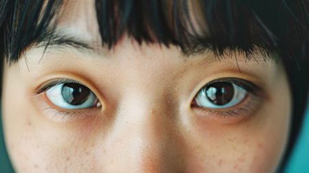 Close up of beautiful Asian woman with blue eyes looking at camera.