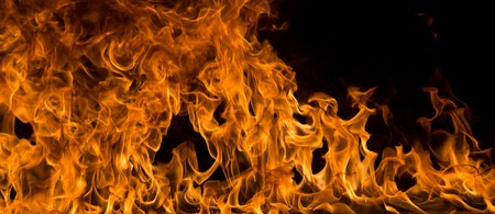 Fire with colorful flames. Big blaze on black background. Close up view with details, banner, space for text.