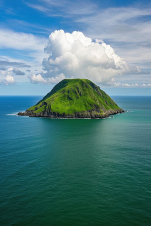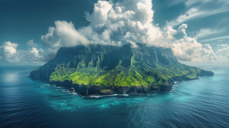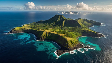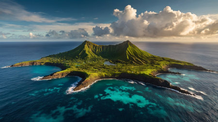 high-altitude shot of a volcanic island in the ocean, created with generative ai