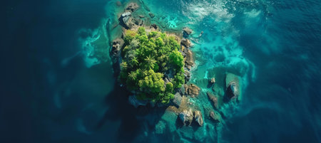 Aerial view of a small tropical island surrounded by turquoise water, secluded and serene