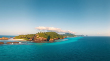 A stunning tropical island lush with greenery is surrounded by clear blue waters under a bright sky. This serene landscape evokes a sense of tranquility and natural beauty.