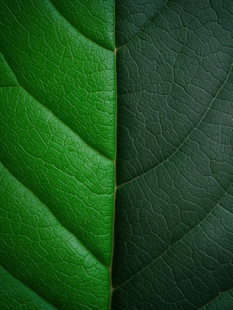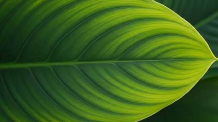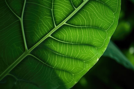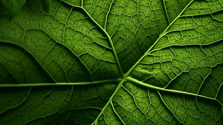 Texture showing close up macro shot of a vibrant green leaf with intricate veins and soft light highlighting its...