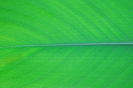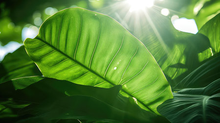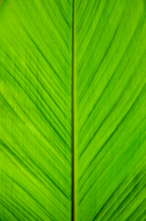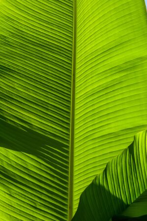 Close-up of vibrant green banana leaf showing detailed vein structure and natural textures. Perfect for eco-friendly branding, wellness concepts.