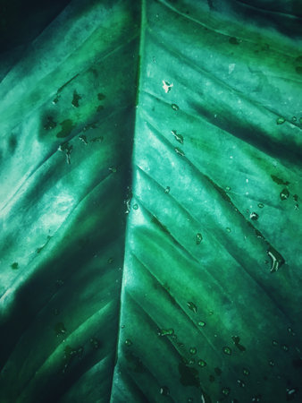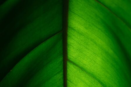 Tropical dark green leaf texture in backlight. Macro abstract nature background.