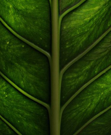 Leaf from elephant ear plant back lit close up showing the texture and veins of it.