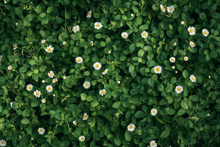 Close-up view of a dense patch of clover plants with small white flowers. The image showcases the intricate details of the leaves and flowers, creating a vibrant natural scene.