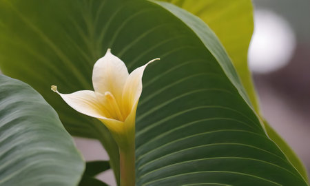 The photo of the flower was taken in the jungle of the Caribbean island. The lighting in the photo is natural, the background is blurred, in the center of the composition is a yelllow flower bud.