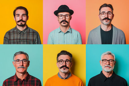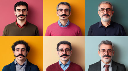 Collage of men with different mustaches posing against color backgrounds, AI Generated