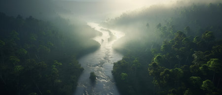 A tranquil river flows through verdant mountains, enveloped in morning mist. The serene landscape captures the essence of nature's beauty and calmness at dawn.