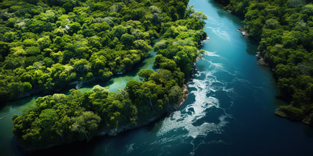 An aerial view showcases a breathtaking landscape featuring a winding river enveloped by vibrant, lush greenery. Generative AI