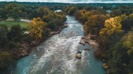 Kayakers paddle through a lively river filled with rapids, framed by vibrant autumn trees, under a cloudy sky, creating a serene yet adventurous atmosphere.