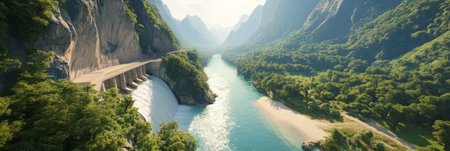 Scenic view of a river flowing through lush green mountains with a dam. The captured image highlights the harmonious blend of nature and infrastructure in a peaceful setting, AI Generated