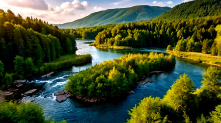 An aerial perspective captures a winding river snaking its way through a dense forest bathed in the warm, golden light of either sunrise or sunset. The sunlight filters through the lush green canopy, creating a dappled effect and illuminating the trees with a vibrant glow. The river's surface reflects the warm light and the surrounding foliage, adding to the serene and tranquil atmosphere of the scene. The vast expanse of the forest and the gentle curve of the river create a picturesque and...