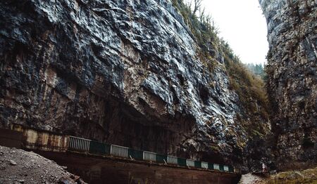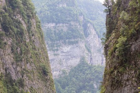 Stone bag Abkhazia in spring. Canyon road surrounded by rocks.Trees grow on a ridge. Cliffy mountains above the road. Unusual place in mountainous areas.