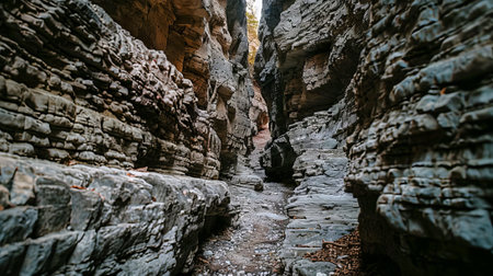 Narrow Rocky Cave Passageway with Jagged Rocks and Subtle Sunlight. Concept of Natural Exploration, Adventurous Journey, Geological Features, and Rugged Terrain.
