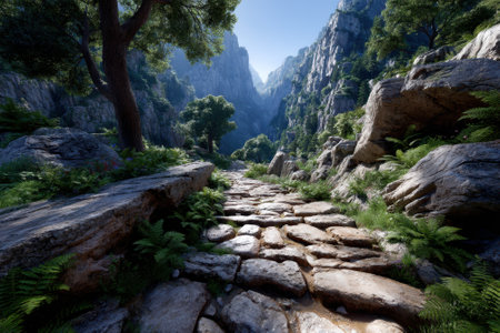 A winding rocky path leads through verdant ferns and towering cliffs under a clear blue sky.