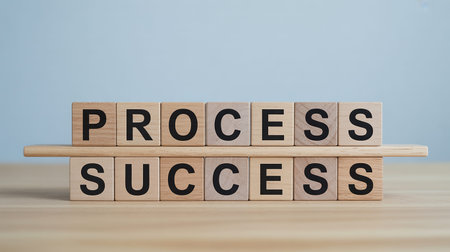 Wooden blocks spelling PROCESS and SUCCESS are arranged on a wooden shelf against a light blue background.