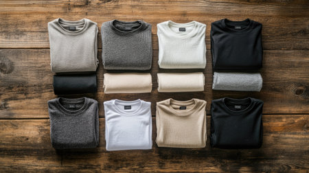 A top view of a selection of folded t-shirts in neutral tones, arranged on a wooden table.