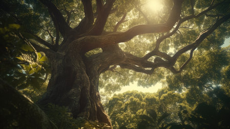 A large, ancient tree with thick, sprawling branches stands majestically in a sunlit forest. Beams of sunlight filter through the dense, vibrant green leaves, casting a gentle glow on the forest floor. The image captures the intricate, intertwining branches and the texture of the tree's bark, creating a magical, enchanted forest atmosphere.