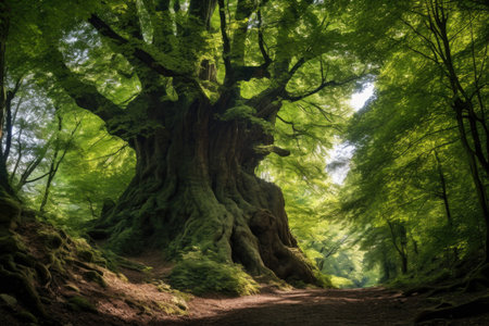 Witness the majesty of an ancient oak tree, its enormous trunk and exposed roots dominating a vibrant green forest landscape. This stunning image captures the strength and resilience of the old growth, highlighting the textured bark and sprawling branches. Perfect for projects focused on nature, environment, or the beauty of the wild, this photograph offers a glimpse into a thriving ecosystem. The image evokes a feeling of awe and could be used for educational materials, environmental campaigns, or artistic compositions.