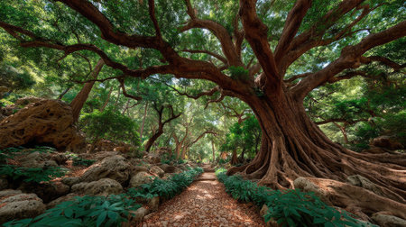 A grand, ancient tree dominates a verdant forest. A winding stone path leads through abundant ferns and greenery.