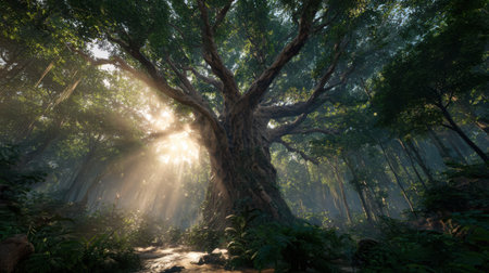 Majestic Tree with Sunlight Streaming Through Branches in Serene Forest Setting