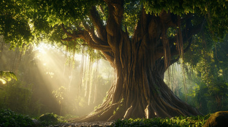 Majestic rainforest tree, sunlight beams through dense canopy