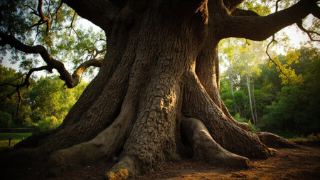 A centuries-old tree with expansive roots bathed in the soft glow of dawn, nestled within a vibrant, verdant woodland setting.