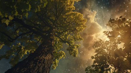 A majestic night sky adorned with countless twinkling stars shining above towering trees, creating a magical and enchanting scene.