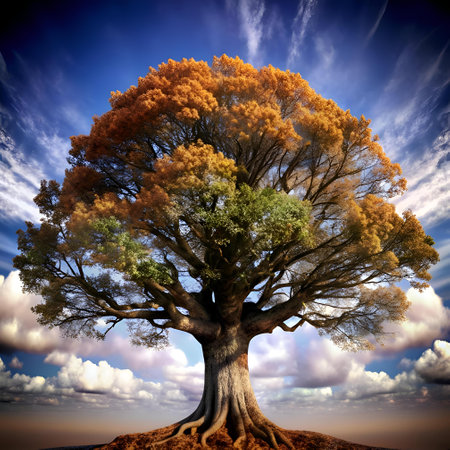 Serene scene people meditating beneath a majestic tree with vibrant colorful foliage and blue sky
