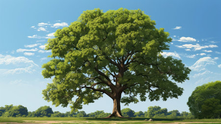 A majestic zelkova tree stands tall against a vibrant sunset sky. This 3D illustration captures the beauty of nature. perfect for environmental and ecological themes.