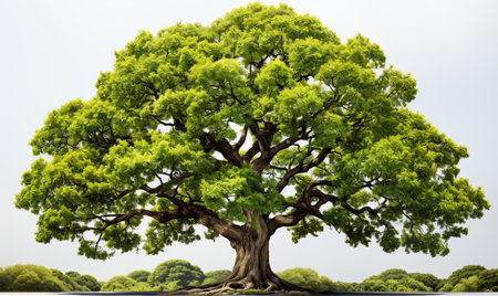 Majestic oak tree with sprawling branches and rough fissured trunk in lush green canopy