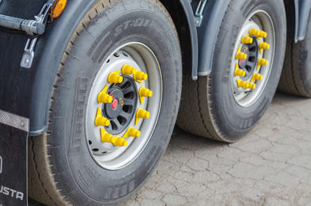 The rear axle with the spikes of the truck. Truck tractor with semi-trailer. Commercial truck. Ukraine, Nikolaev - 08 19 2021