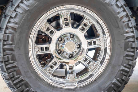 Close up of the black rubber tire of an off roading truck with shiny chrome mags. The clean wheel of a vehicle with polished wheel rim.