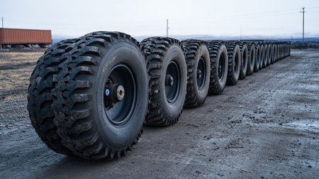 A textured, mud-covered tire designed for tough terrains, set against a softly-focused workshop scene that highlights its durability and rugged construction.