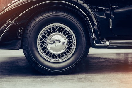 Wheel of an old classic retro car at an exhibition of vintage cars
