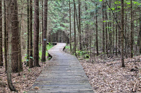 Wooden plank road in the forest, a secret place of green forest