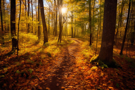 Sun rays break through the trees and illuminate the path covered with fallen leaves in the autumn forest. Selective focus