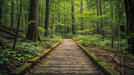 Escape into nature with this serene forest scene bathed in morning light. A wooden pathway invites you to explore this tranquil landscape. Perfect for wellness projects.