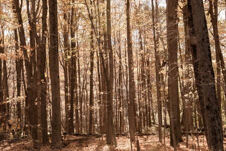 Autumnal forest landscape with vintage mood filter. Fall forest in vintage colors.