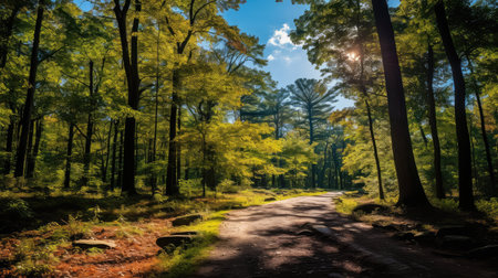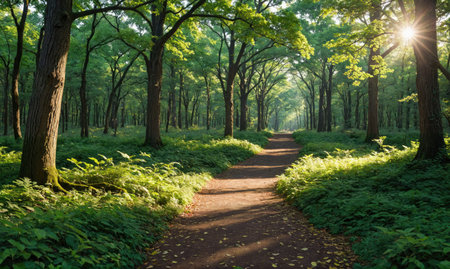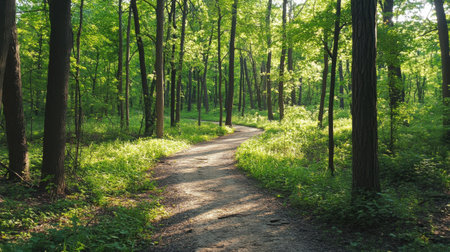 A meandering path leads through a vibrant green forest. Sunlight filters through the trees, illuminating the fresh foliage, creating a serene atmosphere for nature walks.