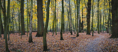 Panorama of a autumn yellow forest with walk path between the trees