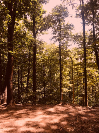 Serene forest scene featuring tall, straight pine trees with sunlight filtering through branches, creating warm and inviting atmosphere. vibrant colors of nature evoke sense of peace