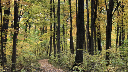 Path in a forest with colorful autumn leaves and trees