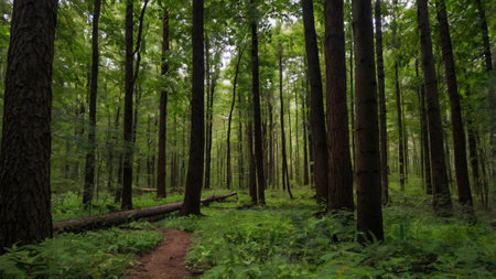 Discover a tranquil forest pathway enveloped in lush greenery and majestic trees, perfect for nature walks, peaceful retreats, and outdoor exploration.