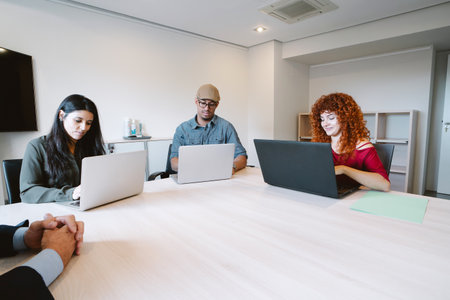 Young entrepreneurs collaborating on a business idea in a modern office environment with laptops