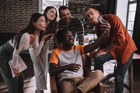 happy african american businessman taking selfie on smartphone while sitting in armchair surrounded by cheerful multicultural colleagues