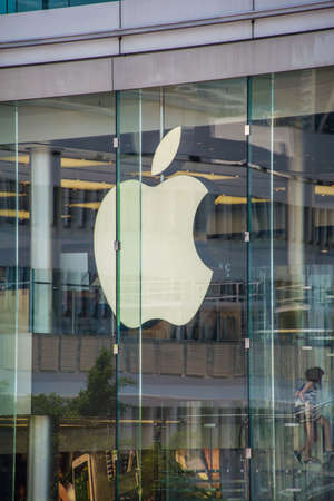 HongKong - November, 2019: The Apple Logo on Apple Store facade in Hongkong at night